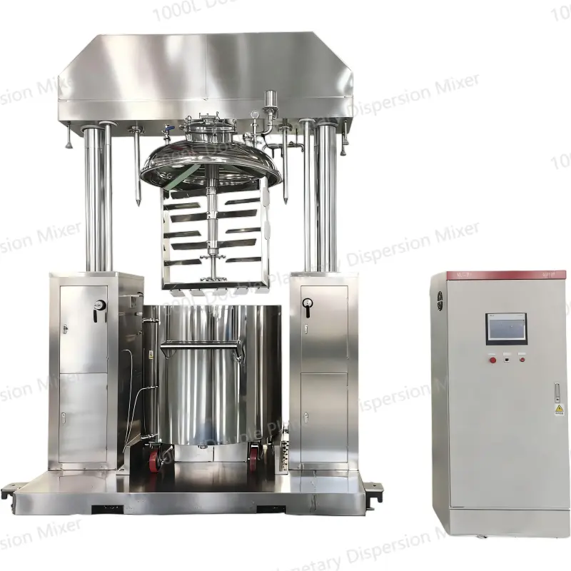 The 1000L Double Planetary Dispersion Mixer is a high-performance equipment for mixing, dispersing and homogenizing high-viscosity, high-solid-content materials. Widely used in adhesives, coatings, composites, and pharmaceuticals, it adopts a dual-planetary stirring structure—mixing blades revolve around the tank center while rotating on their own axes. With strong shearing, kneading and dispersing capabilities, it ensures uniform material mixing, and features a durable stainless-steel tank and intelligent control, ideal for large-scale industrial production.